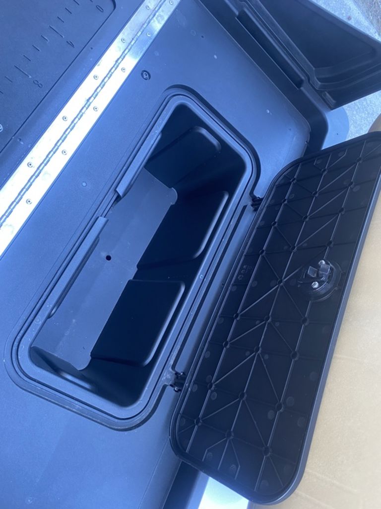 The rear-facing flip seat takes storage to a new level with space to keep a bag or strap in a cooler.