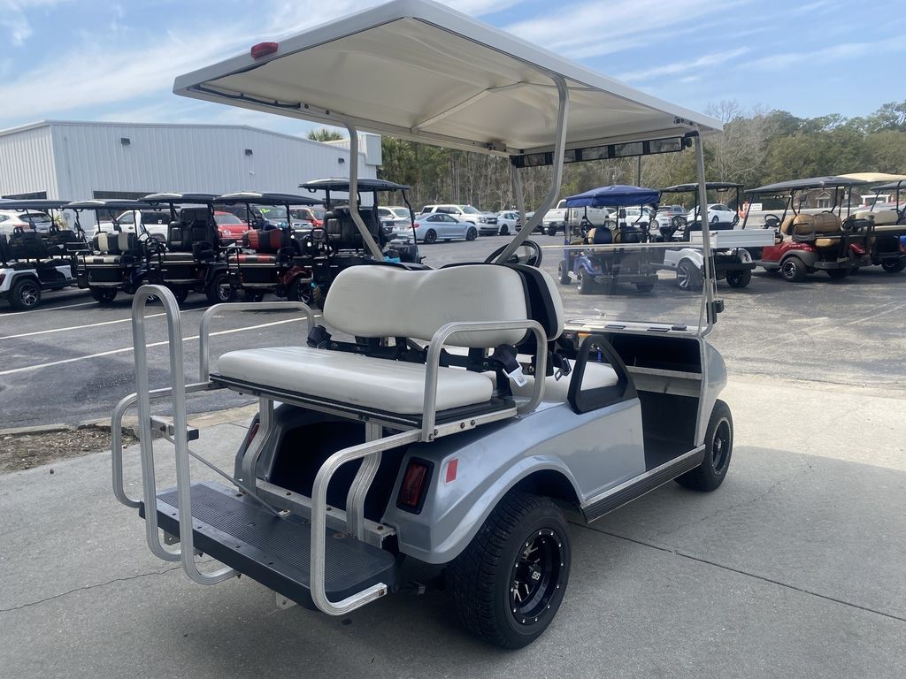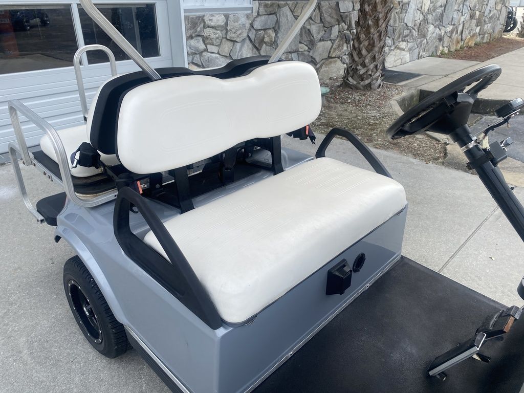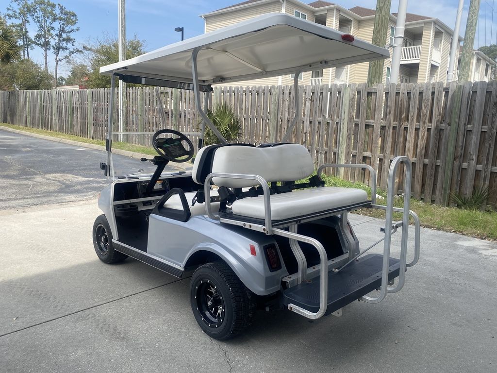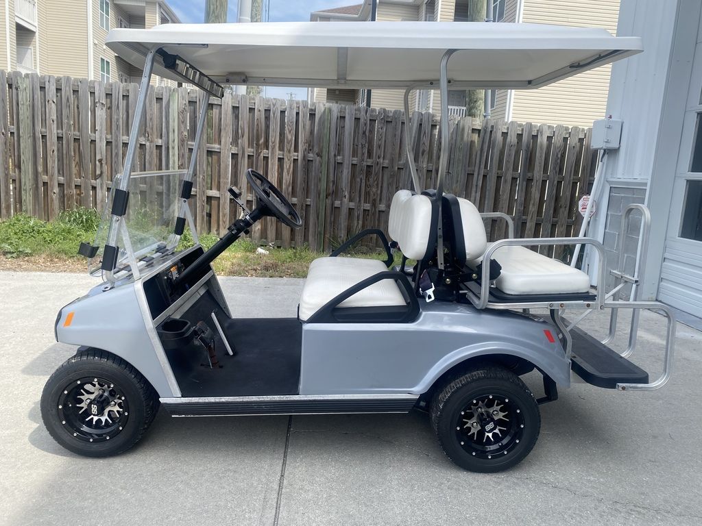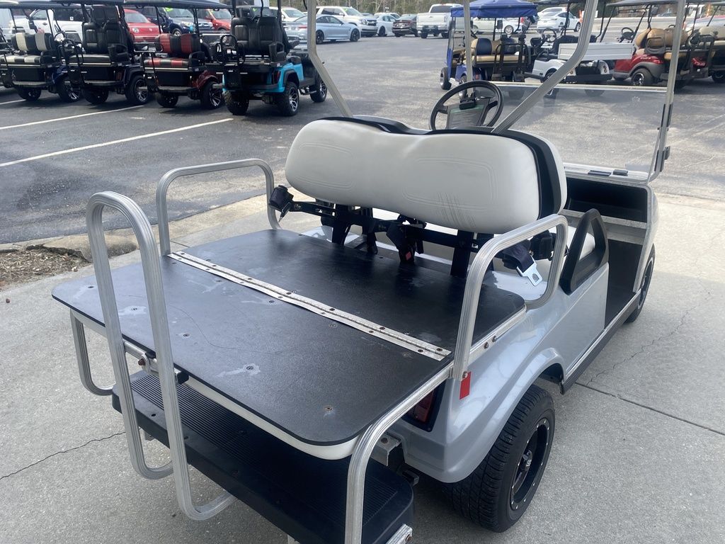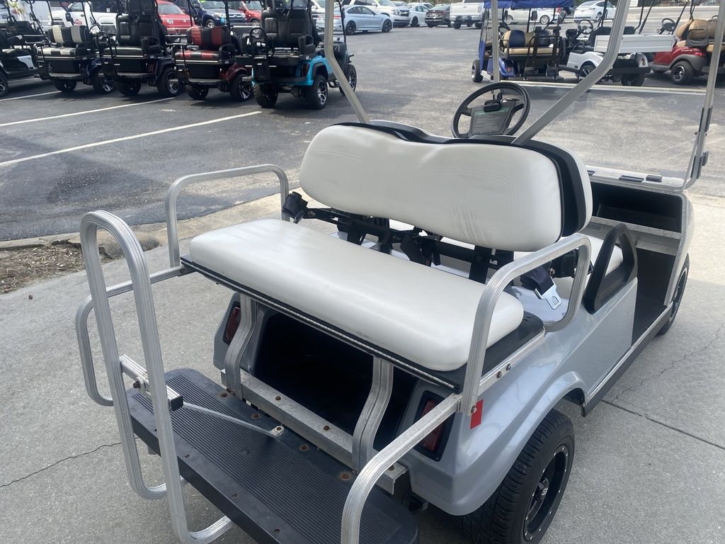Beneath its sleek silver exterior lies a robust electric system powered by deep cycle batteries, ensuring you have the range and reliability to enjoy every journey. Whether you’re cruising along the fairway or navigating a bustling community, this golf cart promises a ride that’s both efficient and environmentally friendly.